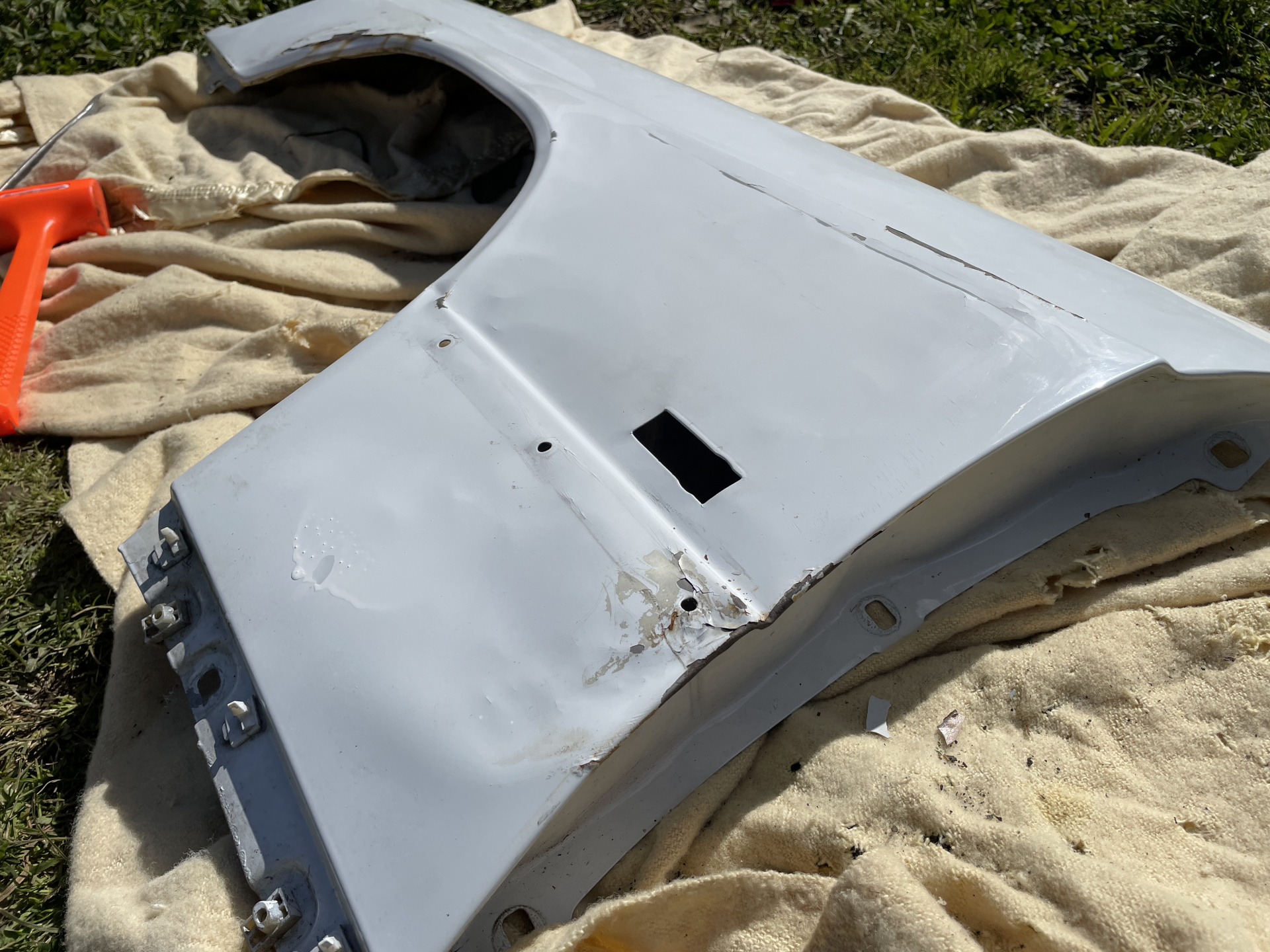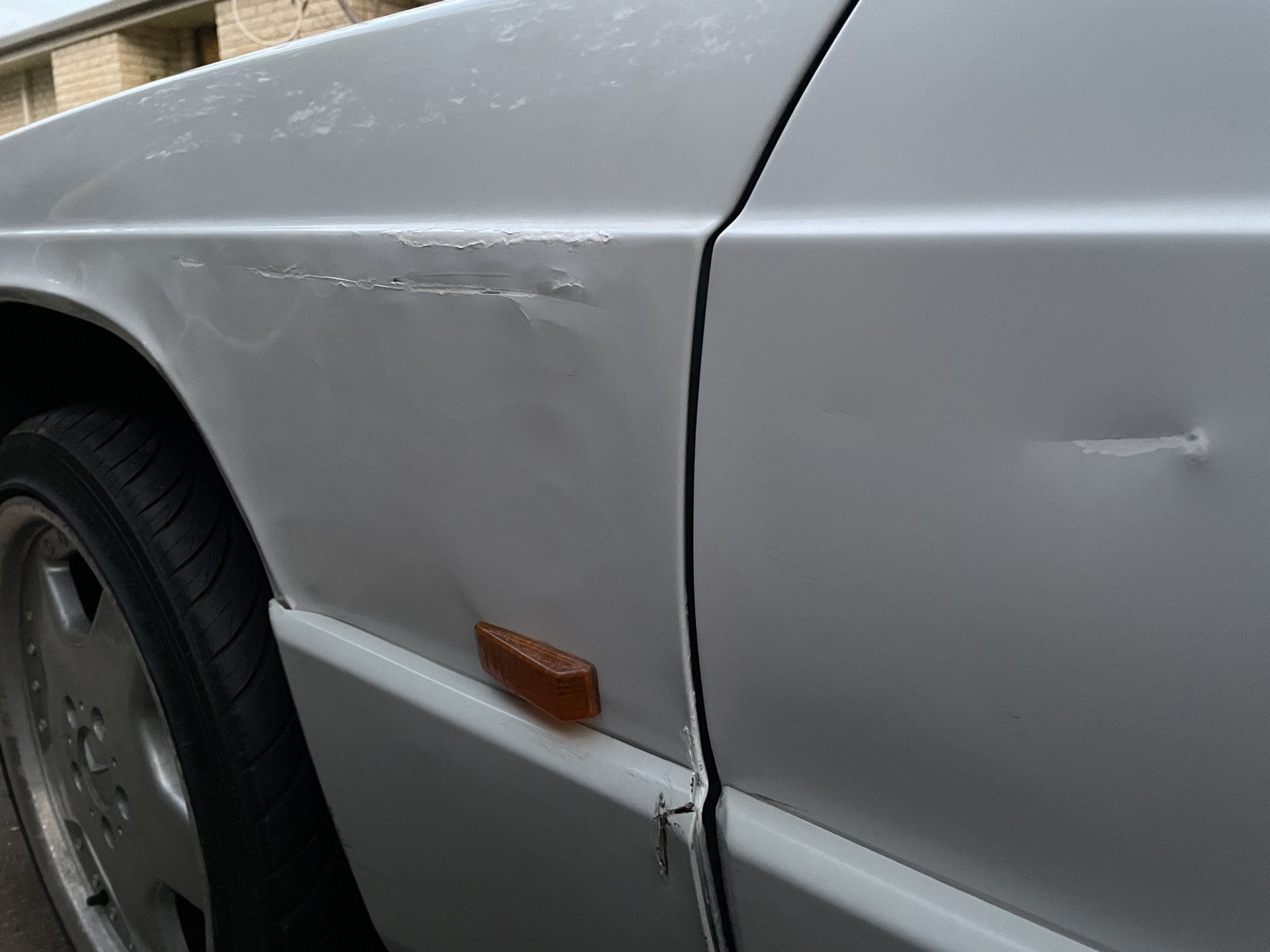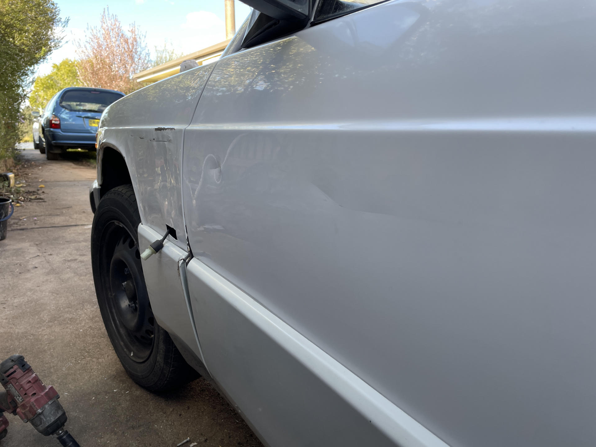 The door was remarkably co-operative. There’s a scrape above the Sacco panel, but not too bad. It was pretty bent in, under the Sacco panel, but a bit of levering from the inside pushed it back into place.