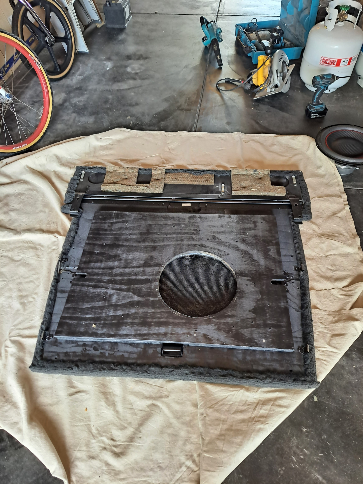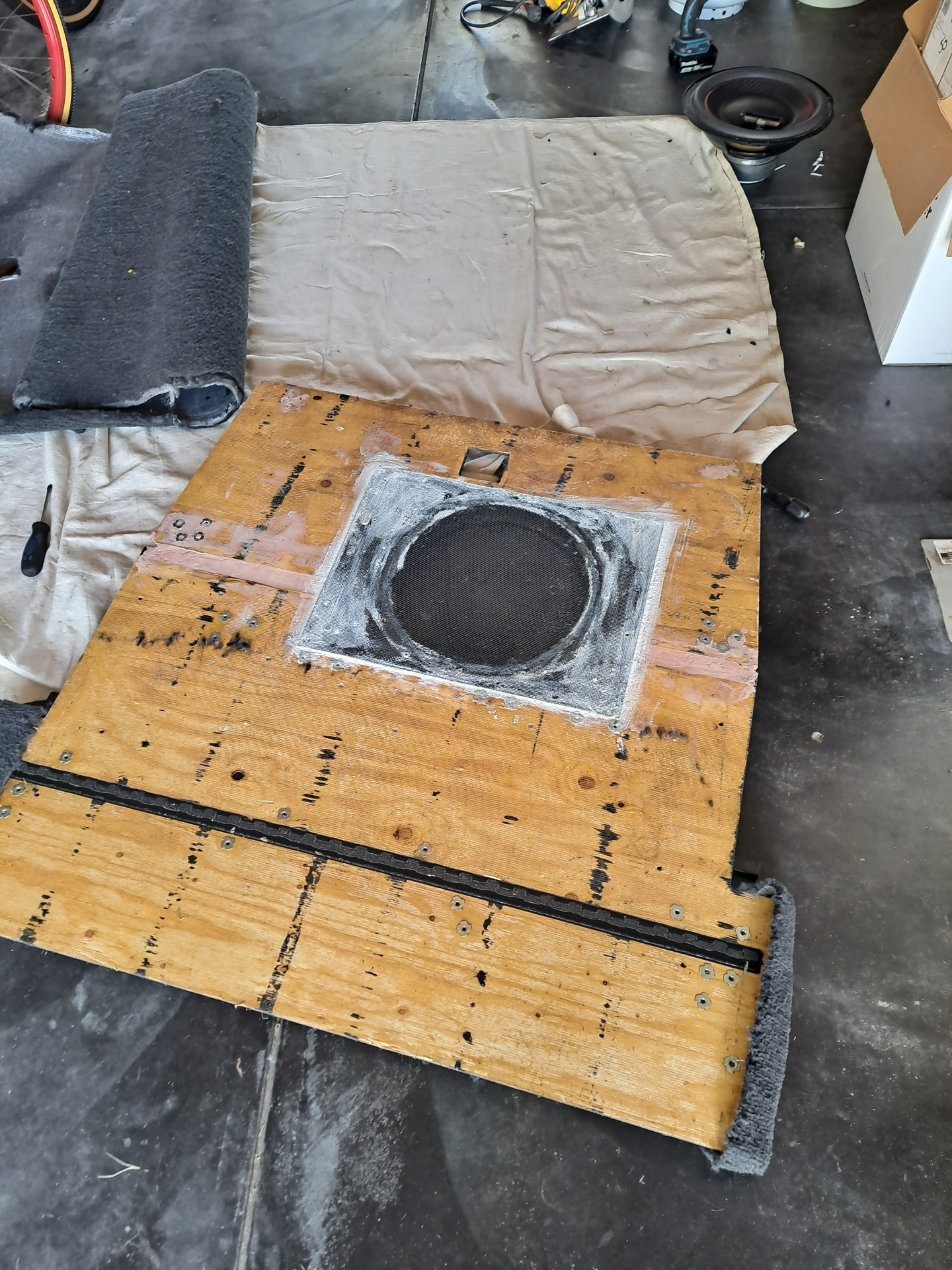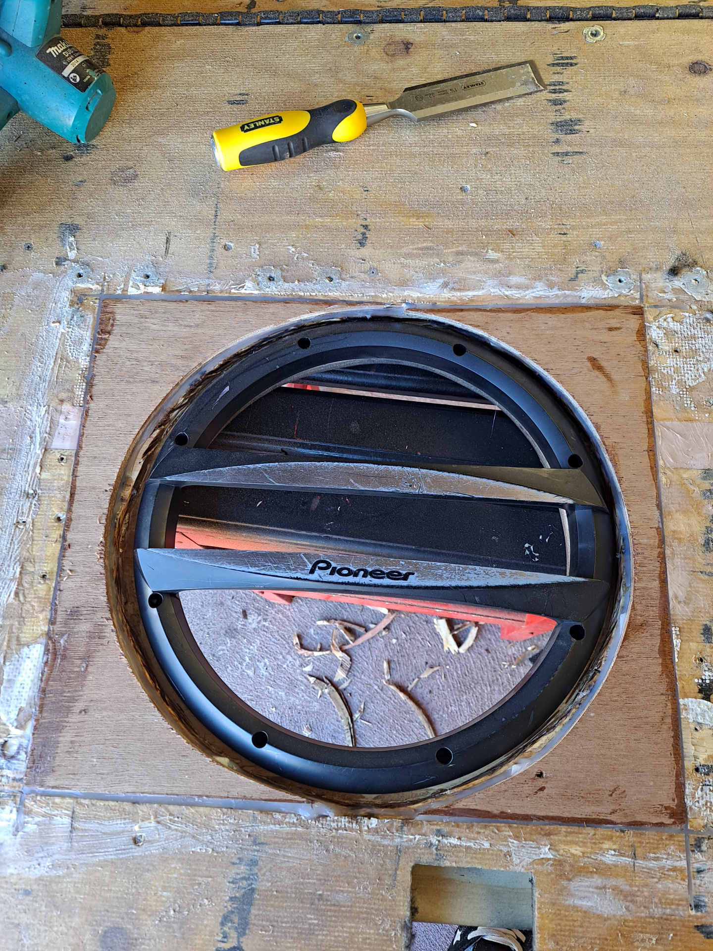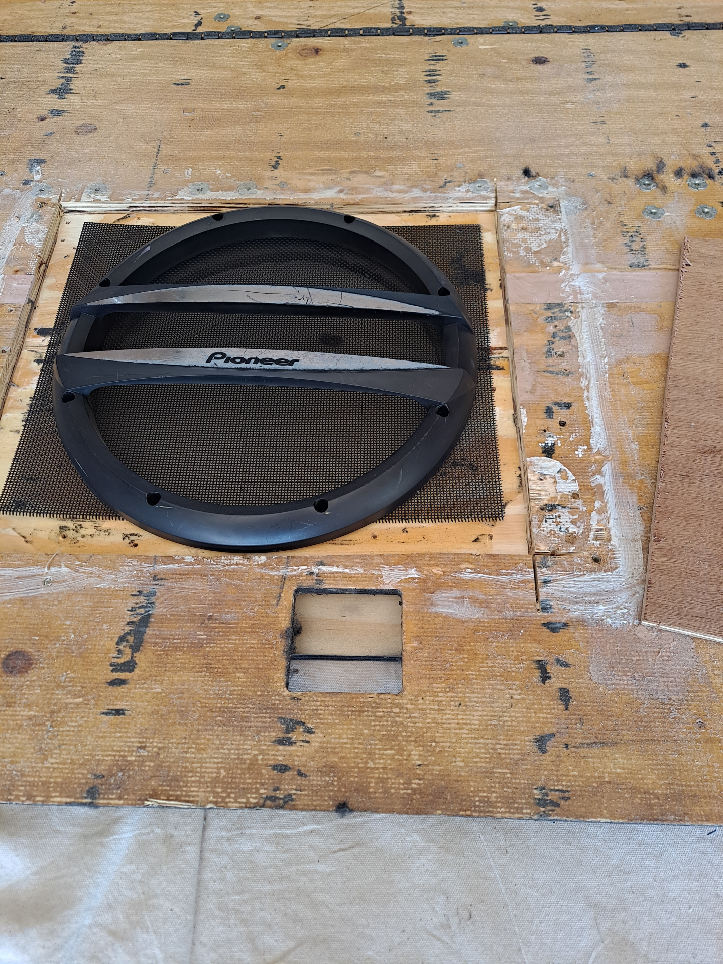 At this stage the plan was to take the mesh off ,cut a square out of the top layer , put new ply in and cut holes into it and recover with the carpet . At this stage i changed my mind .