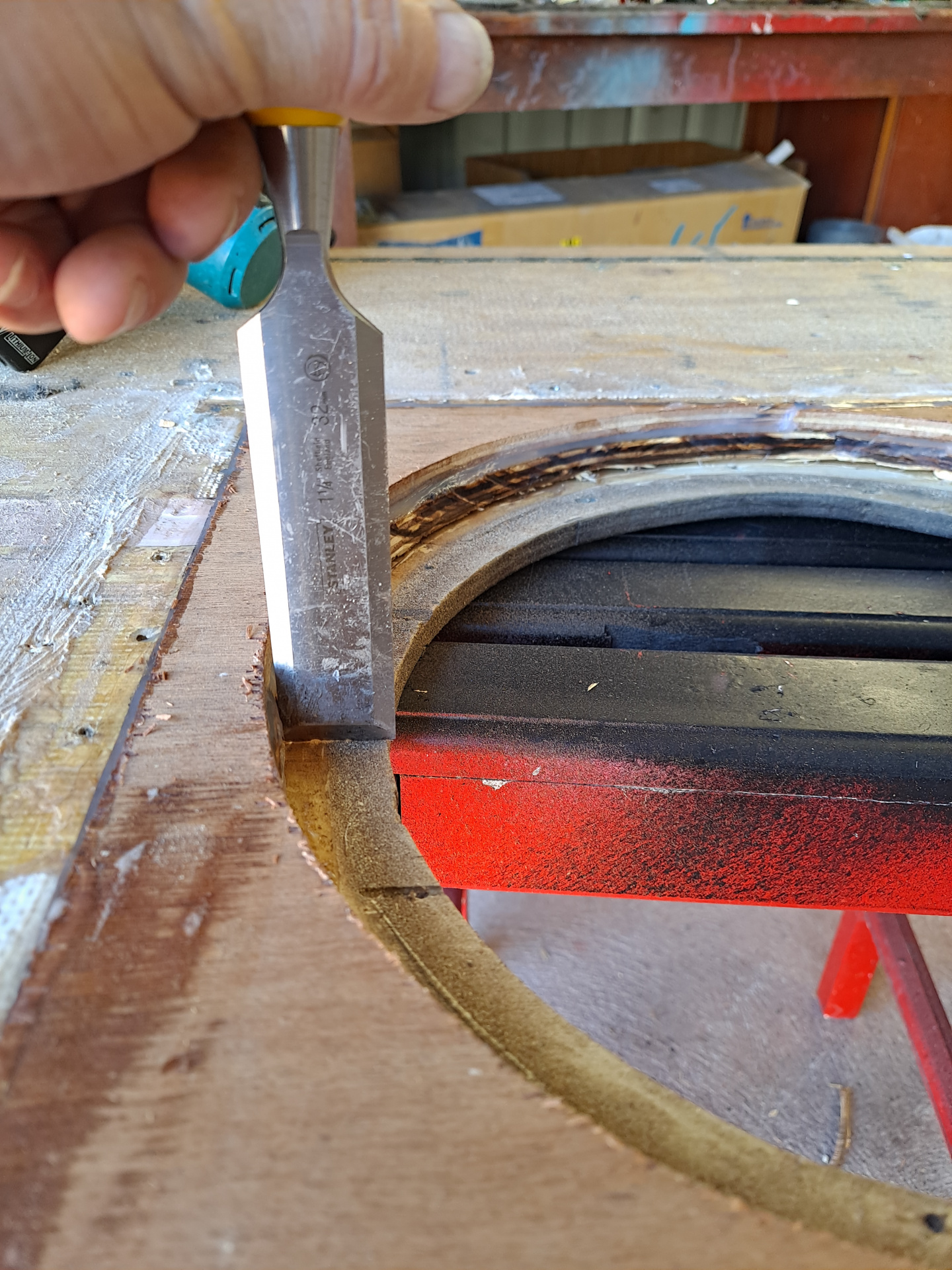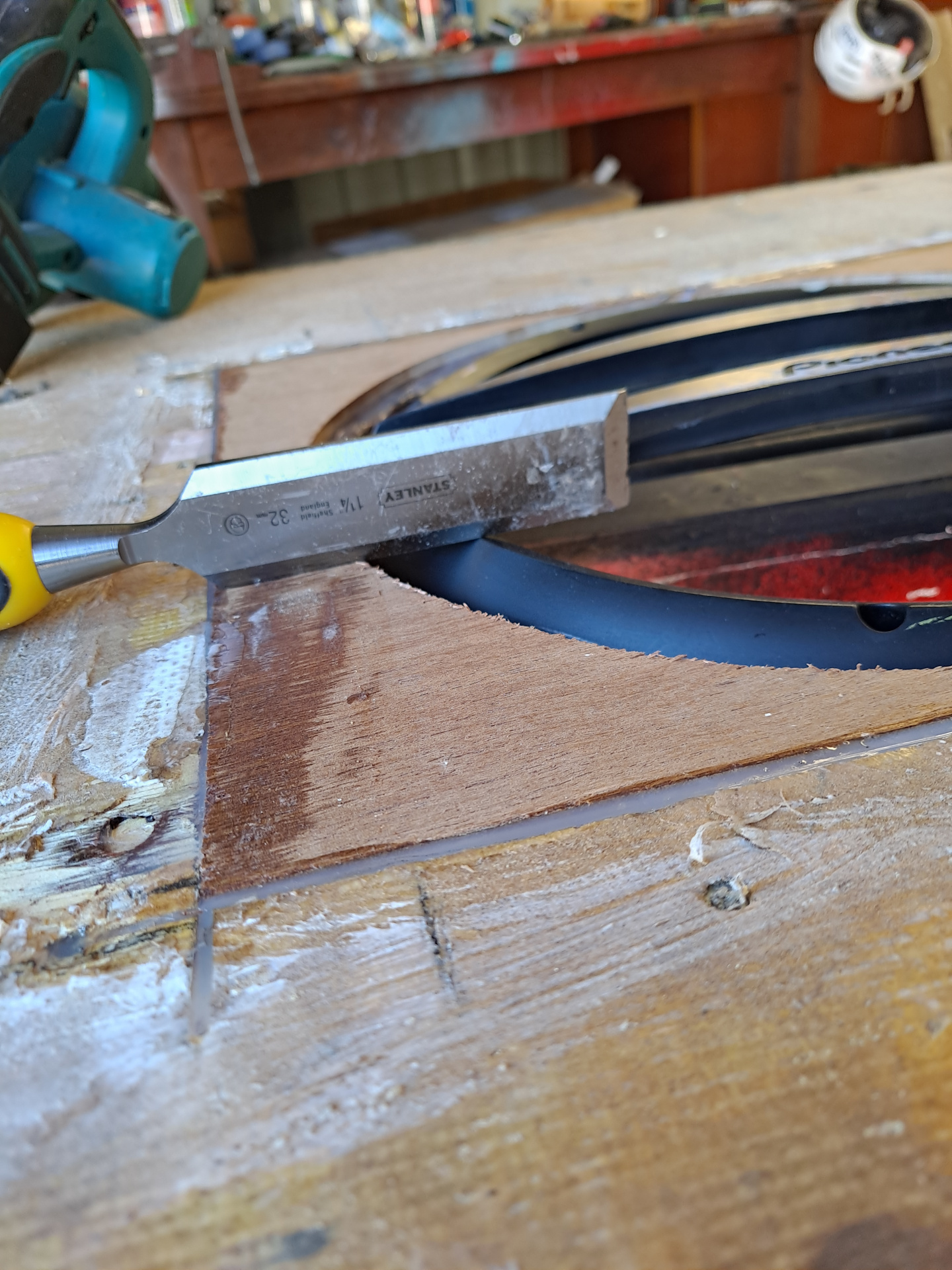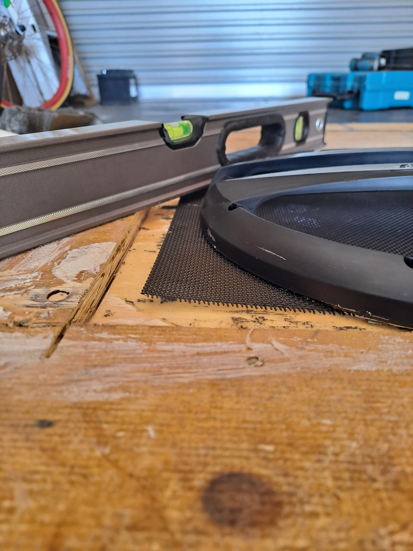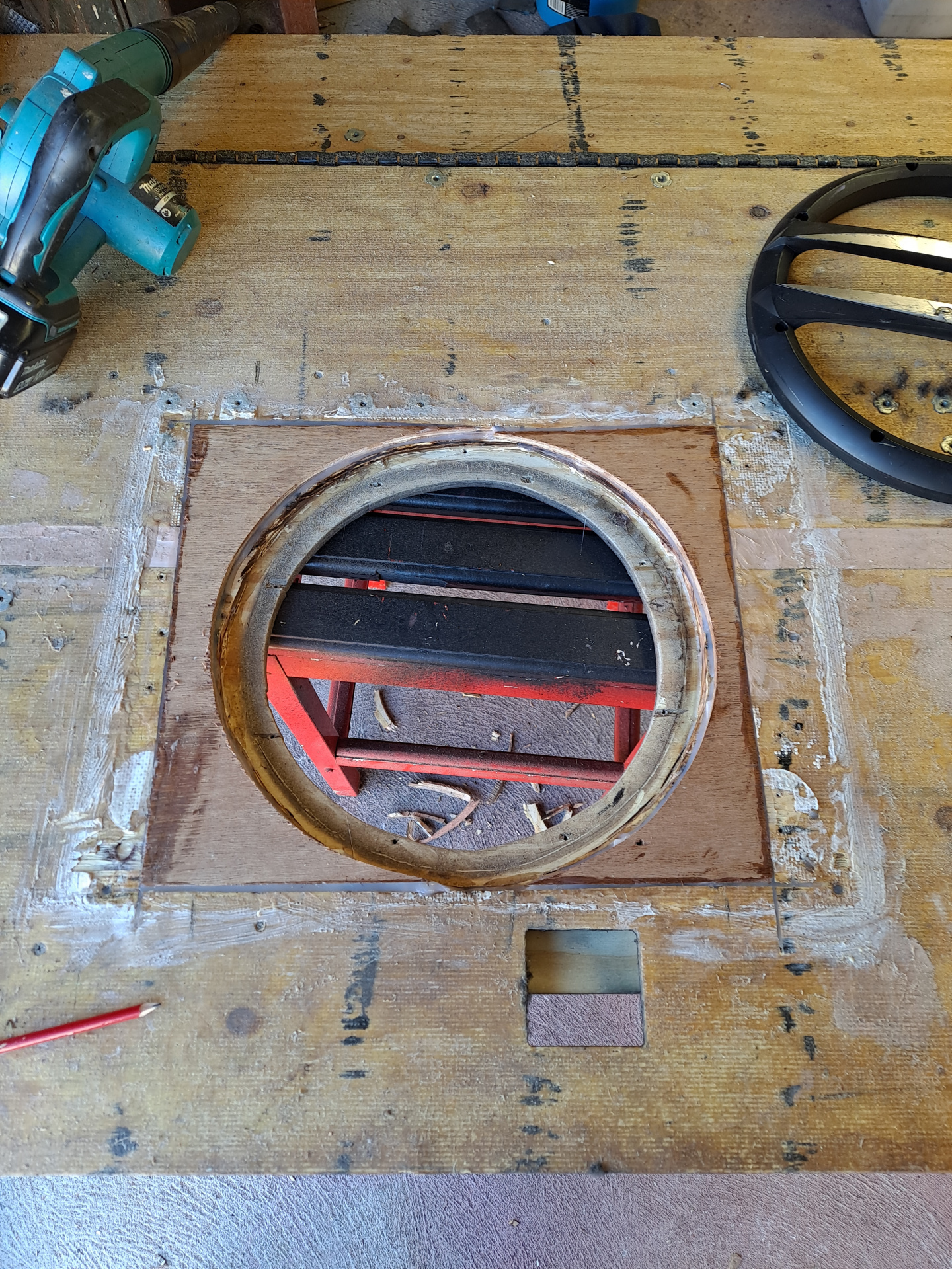 At this stage the plan was to take the mesh off ,cut a square out of the top layer , put new ply in and cut holes into it and recover with the carpet . At this stage i changed my mind .