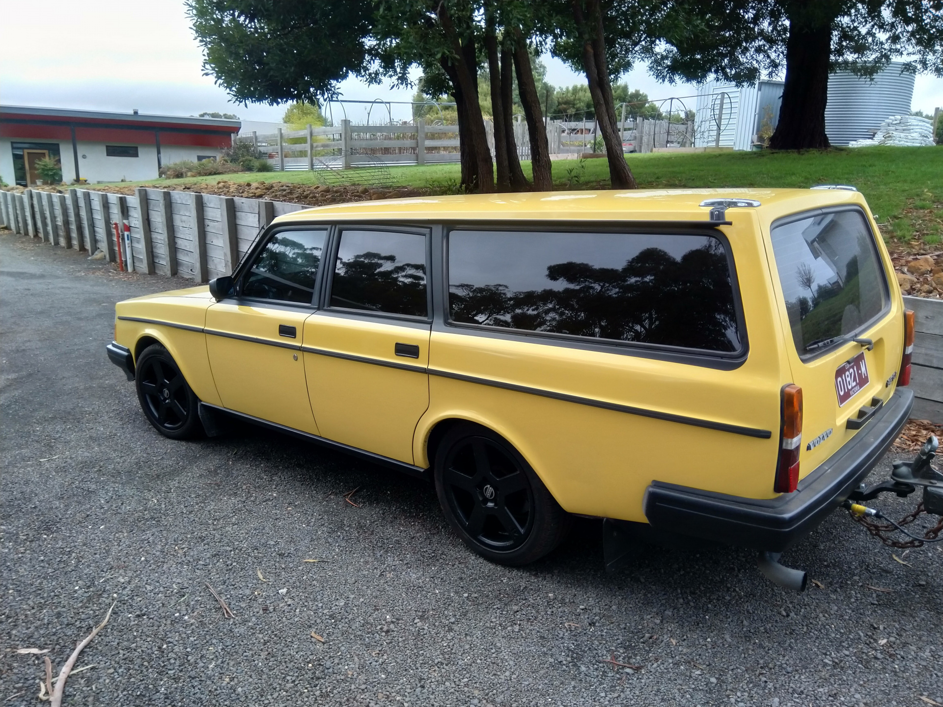 Black 17-inch Pegasus replicas are back on. I think they look a lot better than the gunmetal grey Virgo replicas I had on. The only problem is black wheels are so hard to photograph! :) Picked up some mulch with the trailer today. The clutch is really sketchy, especially in reverse (chatters a lot in reverse, but not so much in 1st gear...odd.) This was a semi-dodgy (AKA Titanic wreckage) clutch kit I got from Classic Swede. Probably shoud have put a 740T clutch kit in it. Someday the gearbox will have to come out anyway to address the rear main seal leak. That's a job for another decade. :)